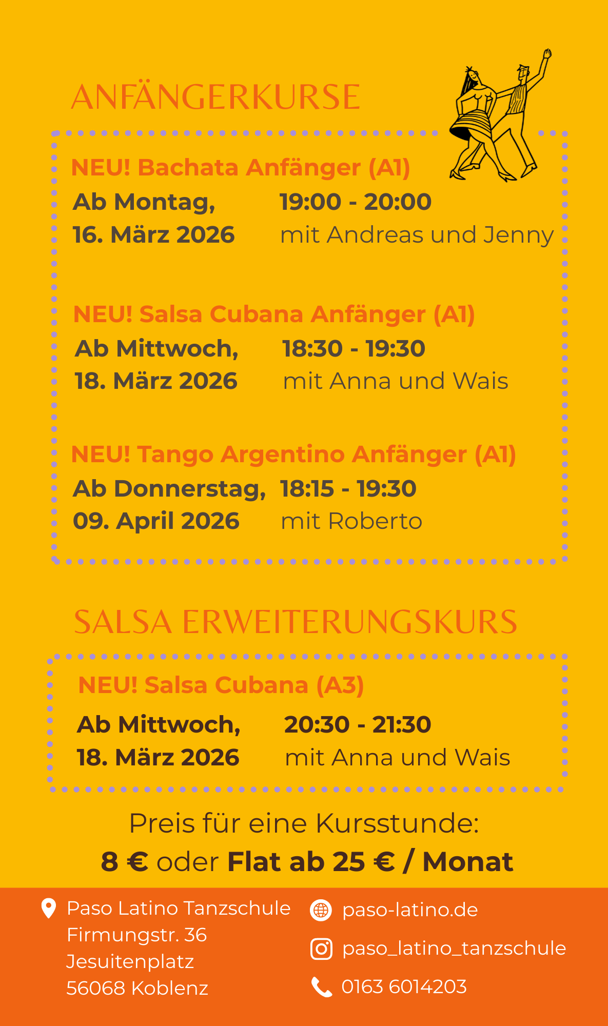 INFO: Ab dem 10.09.2025 wurde der 18:30 Uhr Mittwochskurs Salsa mit dem 19:30 Uhr Mittwochskurs Salsa zusammengelegt.